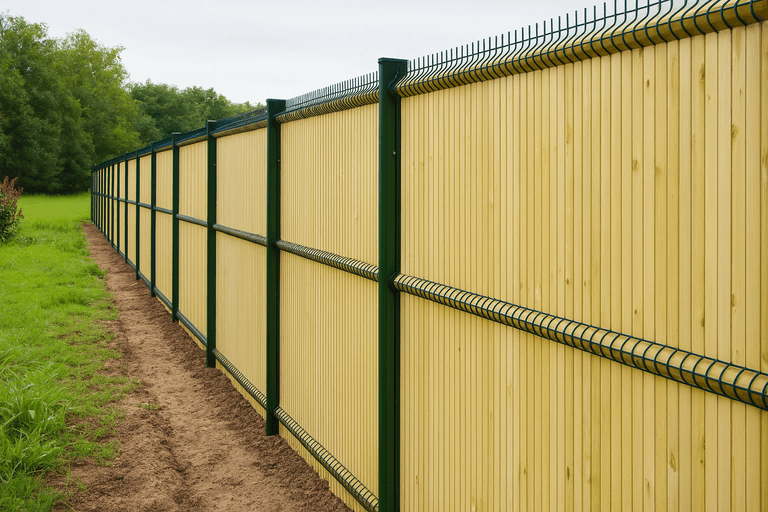 Металлические или деревянные стойки монтируются с шагом 2–2,5 метра. Важно соблюдать вертикаль, глубину заглубления и надежную фиксацию — с использованием бетона или забивных анкеров. -